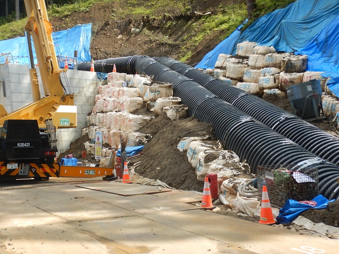 切り回し 独立山ダブルプレスト管Φ1350 目的 砂防堰堤築造中の迂回水路として使用頂きました。 採用理由 他製品に比べ、製品が長尺で、軽量である事から配管時や撤去時の際に、所要日数が少なくて済むため採用頂きました。 用途 切り回し 施工場所 長野県 竣工日 2023年7月 使用した製品 独立山ダブルプレスト管 NETIS登録製品 波付管のスタンダード 〈Φ300、Φ400、Φ500、Φ600は中国・四国・九州地区限定〉 波形状を独立山形状にしたことで、接続時の管どうしの突き合わせ作業が簡単に。 前へ 一覧へ戻る 次へ