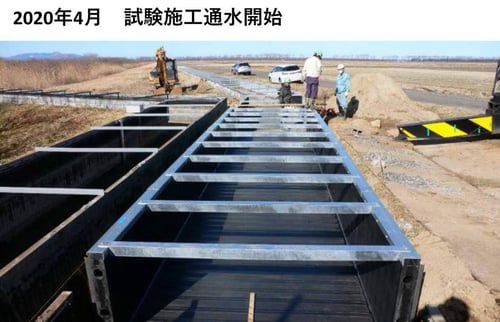 水路改修 目的 【取材目的】 日本有数の米どころとして知られる秋田県大潟村にて、農業用水路の試験施工として、高密度ポリエチレン製の大型ポリ角型U字溝を設置しております。2020年3月の設置から圃場に用水を送り続け、5年弱が経過した現在の状況について、調査結果をご報告致します。 評価 2024年11月現地調査 大型ポリ角型U字溝には変形、亀裂、摩耗、沈下、アングル類の錆び等、一切見受けられず、設置当時の状態を維持しておりました。大型ポリ角型U字溝の特長として、軽量による軟弱地盤での適応性、農薬・塩害にも腐食しない耐久性等、農業用水路としては最適な製品である事が証明されたと言えます。今後も長期間の使用は十分可能であり、ライフサイクルコストの低減にも繋がる製品であると確信しております。 用途 水路改修 施工場所 秋田県 竣工日 2020年3月 前へ 一覧へ戻る 次へ