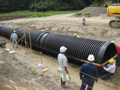 道路 ダイポリンハウエル管R30 Φ1200 目的 道路改良工事に使用されました。 採用理由 JIS K 6780 耐圧ポリエチレンリブ管です。『道路土工 カルバート工指針』(平成21年度版)に追加されました。NETIS活用効果評価が『準推奨技術』に昇格されました。 用途 道路 施工場所 千葉県 使用した製品 ダイポリンハウエル管 JIS規格品 道路土工カルバート工 JIS規格、公的機関の認可や基準に準拠した永久構造物です。 前へ 一覧へ戻る 次へ