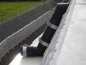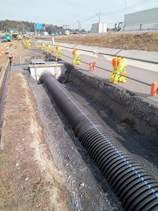 農業用水路を切り回しにて露出配管で長期間使用する工事でした。そのため耐候性に優れ、高い水密性が必要とされたため、ヘグラー管(高耐圧ポリエチレンコルゲート管を採用頂きました。